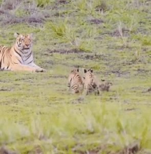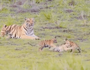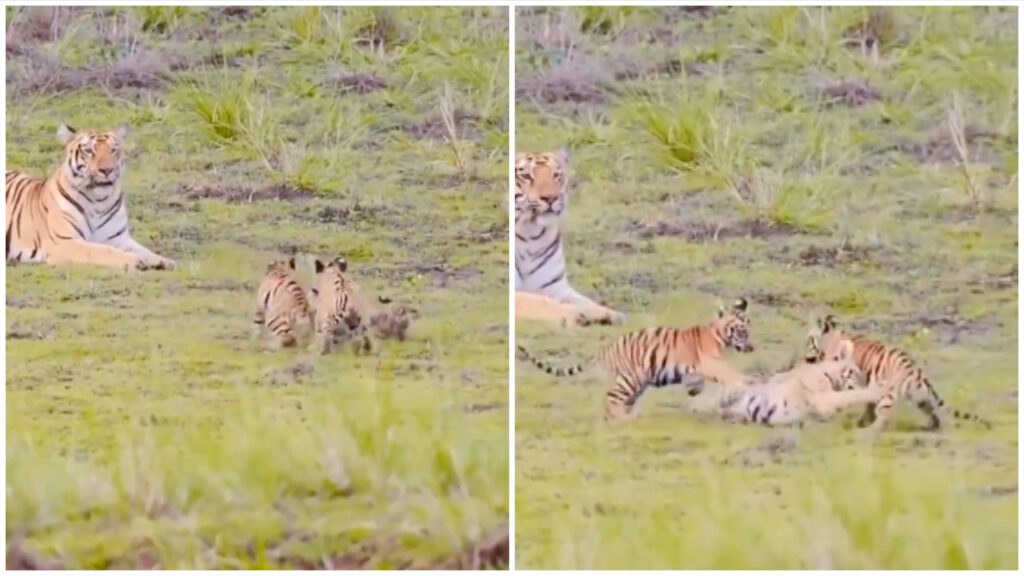 यह वीडियो एक wildlife photographer द्वारा शूट किया गया है, जिन्होंने इस अद्भुत पल को कैमरे में कैद कर लिया। जंगल की शांति में, टाइगर के दो छोटे-छोटे शावक आपस में खेलते नजर आ रहे हैं, और पास ही में उनकी माँ बैठी हुई हैं – जैसे वो दोनों के खेल की रेफरी हों।
